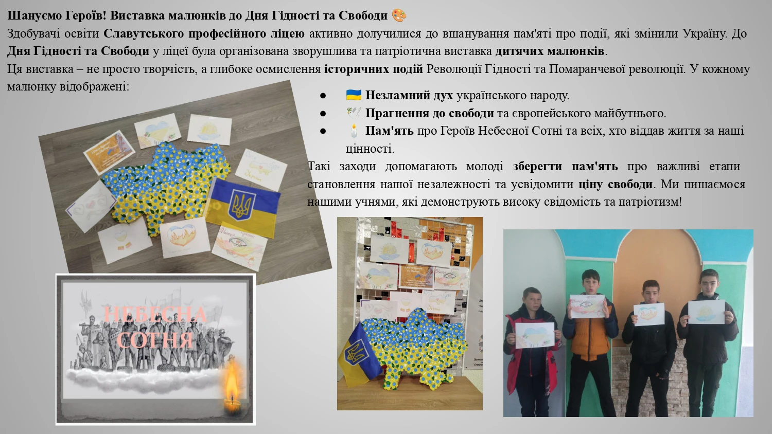 Спільний проєкт народного аматорського колективу “театр пісні “Сусіди” та театр мод ДПТНЗ “Славутський професійний ліцей” вибороли І місце в обласному відкритому патріотичному фестивалі-конкурсі «Мистецька варта». Дякуємо організаторам фестивалю та поважному журі за високу оцінку нашої роботи. Пишаємося талановитою молоддю Славутського професійного ліцею, яка гідно представляє наш заклад і прославляє рідну Хмельниччину!