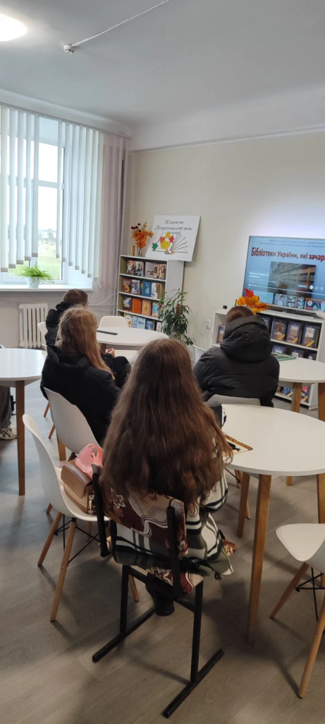 З нагоди відзначення Всеукраїнського дня бібліотек, 30 вересня, для здобувачів освіти ліцею був проведений виховний захід. Бібліотекар Галина ПАРХОМЕНКО повідала про різноманітні бібліотеки України, їх значення в житті кожної людини. Також згадали видатну дату нашого закладу, 20-ту річницю з нагоди відриття ДПТНЗ “Славутський професійний ліцей”, та діяльність його невід’ємної ланки – бібліотеки, а нині вже інформаційного простору. Окрім цього, маємо також і електронну бібліотеку. Завітайте (https://bibliotekaslavprofl.blogspot.com), сподіваємося, стане у пригоді.Ми завжди радіємо нашим користувачам: здобувачам освіти, викладачам, майстрам та тимчасово переміщеним особам, які проживають у громаді. Миру й добра всім нам, любі Українці!